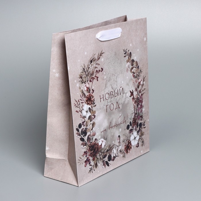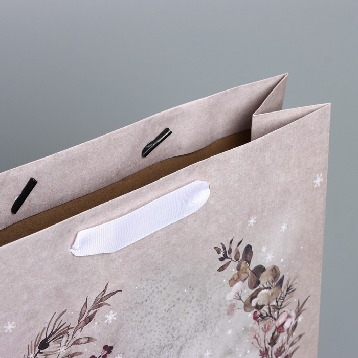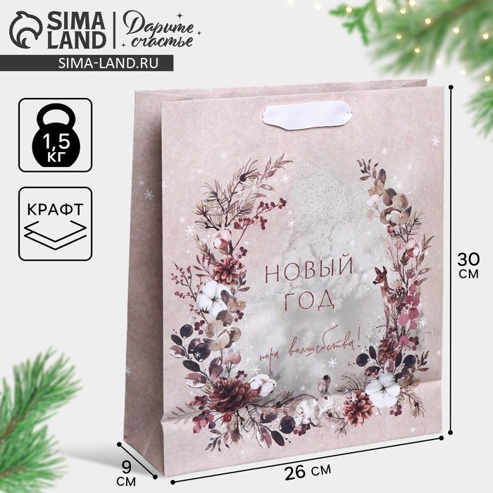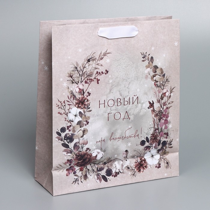 Пакет подарочный новогодний крафтовый вертикальный «Мир волшебства», M 26 х 30 х 9 см, Новый год