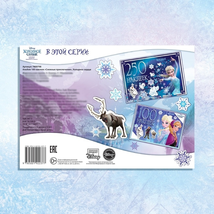 - В альбоме представлено 100 тематических наклеек с красочными изображениями героев мультфильма «Холодное сердце».