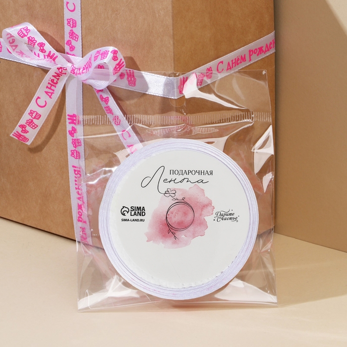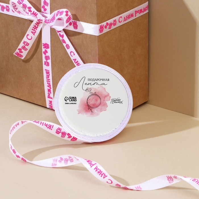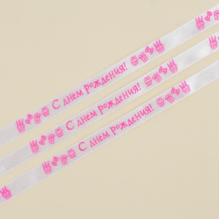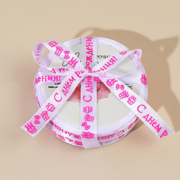 Лента атласная, подарочная упаковка, «С днем рождения!», белая, 1 см х 5 м