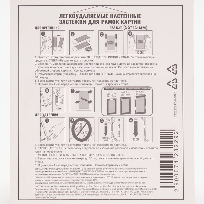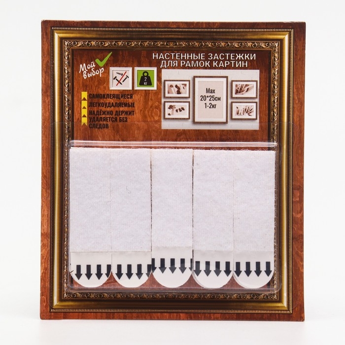 С помощью клейкие застежки Мой выбор ( липучки, крючки на стену, крепеж, полоски) можно легко и безопасно крепить разнообразные аксессуары на вертикальной поверхности. Вы не портите стены, не шумите, не сверлите, никаких лишних движений. При необходимости можно удалить, потянув за клейкую полоску. Благодаря настенным застежкам можно эстетично крепить к стене все что угодно соблюдая весовую нагрузку - роутер, часы, полки, рамки, картины. Одна застежка фиксируется на стене, а другая - на раме. Именно поэтому Вы можете вешать и снимать Ваши фотографии, предметы интерьера столько раз сколько пожелаете. Соблюдайте инструкцию по применению на оборотной стороне упаковки! Подходит для твердых, ровных поверхностей и окрашенных стен. Не подходит для бумажных или виниловых обоев, шероховатых поверхностей.