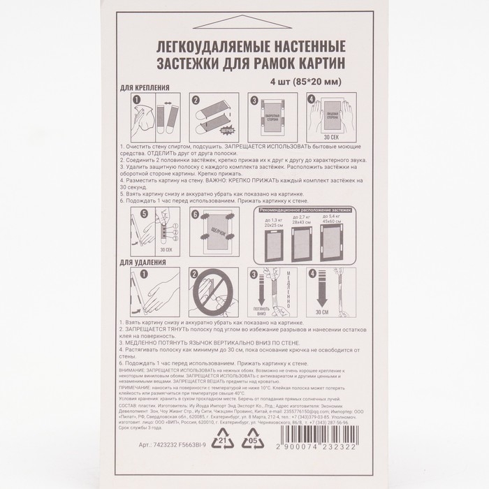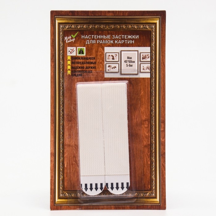 С помощью клейкие застежки Мой выбор ( липучки, крючки на стену, крепеж, полоски) можно легко и безопасно крепить разнообразные аксессуары на вертикальной поверхности. Вы не портите стены, не шумите, не сверлите, никаких лишних движений. При необходимости можно удалить, потянув за клейкую полоску. Благодаря настенным застежкам можно эстетично крепить к стене все что угодно соблюдая весовую нагрузку - роутер, часы, полки, рамки, картины. Одна застежка фиксируется на стене, а другая - на раме. Именно поэтому Вы можете вешать и снимать Ваши фотографии, предметы интерьера столько раз сколько пожелаете. Соблюдайте инструкцию по применению на оборотной стороне упаковки! Подходит для твердых, ровных поверхностей и окрашенных стен. Не подходит для бумажных или виниловых обоев, шероховатых поверхностей.
