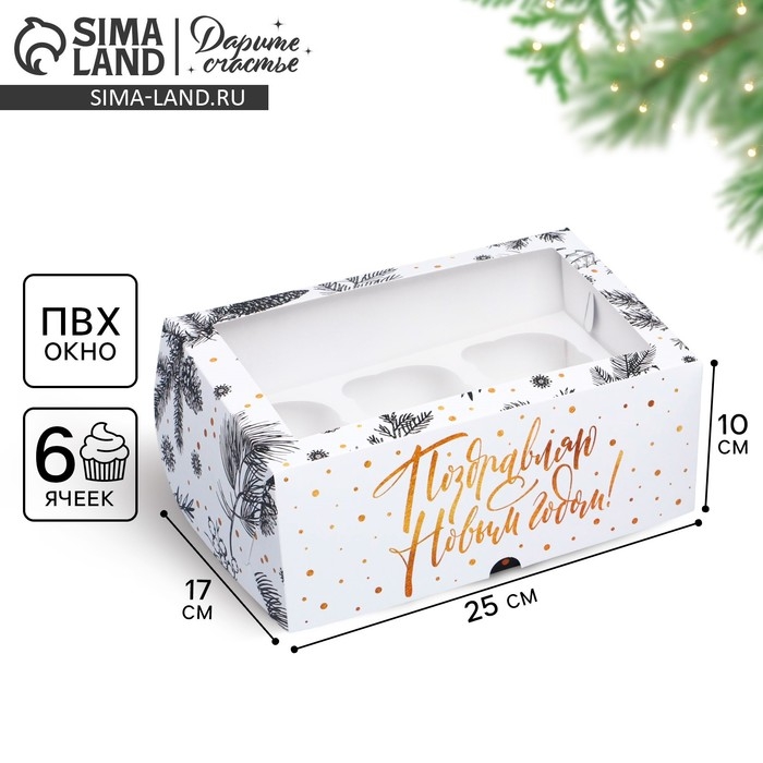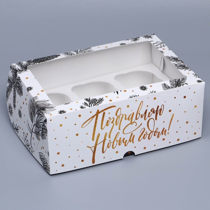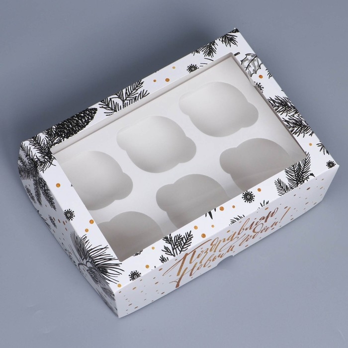 Коробка складная на 6 капкейков с окном «Поздравляю с Новым годом!», 25 х 17 х 10 см, Новый год
