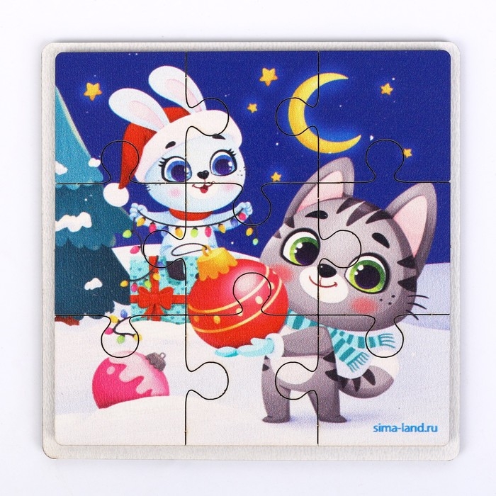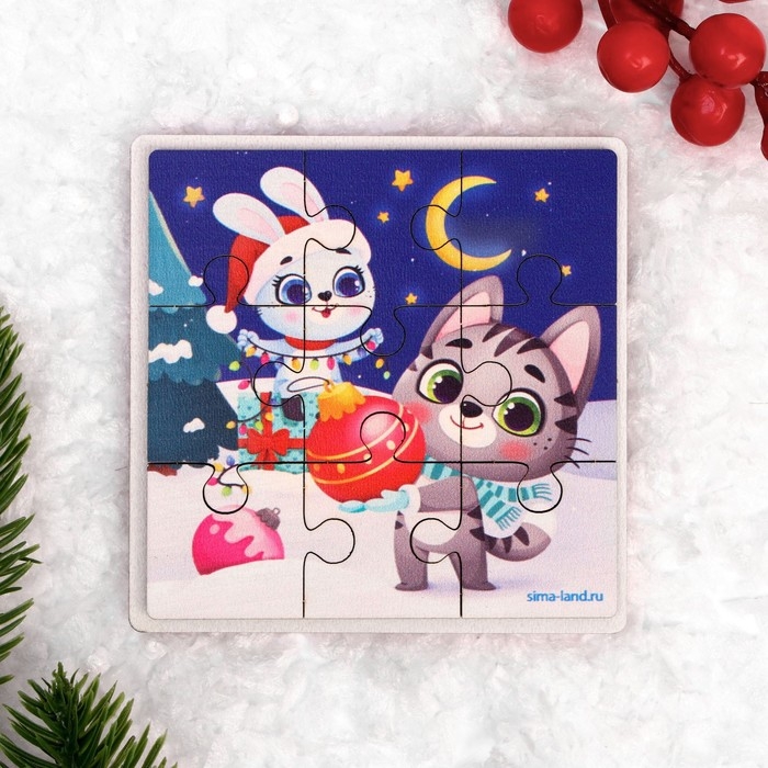 Дервянные пазлы на новый год «Зайка и котик»
