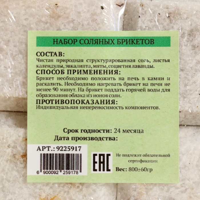 Применение: нагревайте брикет на печи не менее 90 минут, затем поддайте на него горячей воды. Соль наполнит воздух бани ионами, тем самым поможет снять усталость, улучшить кровообращение и общее самочувствие.