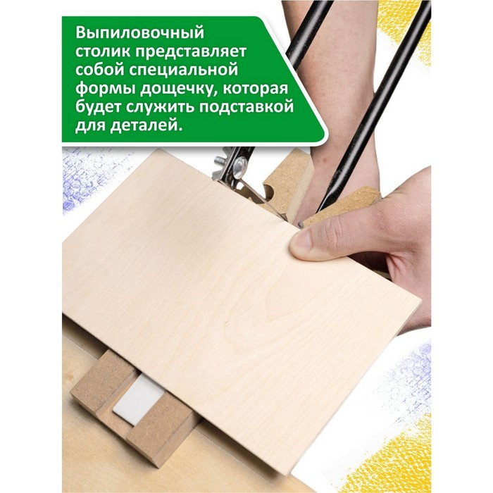 Перед началом работы потренируйтесь на чистой доске, нарисовав линии и геометрические фигуры. После выпиливания модели, рекомендуется произвести окончательную отделку надфилем или наждачной бумагой (не входят в набор), а затем раскрасить.