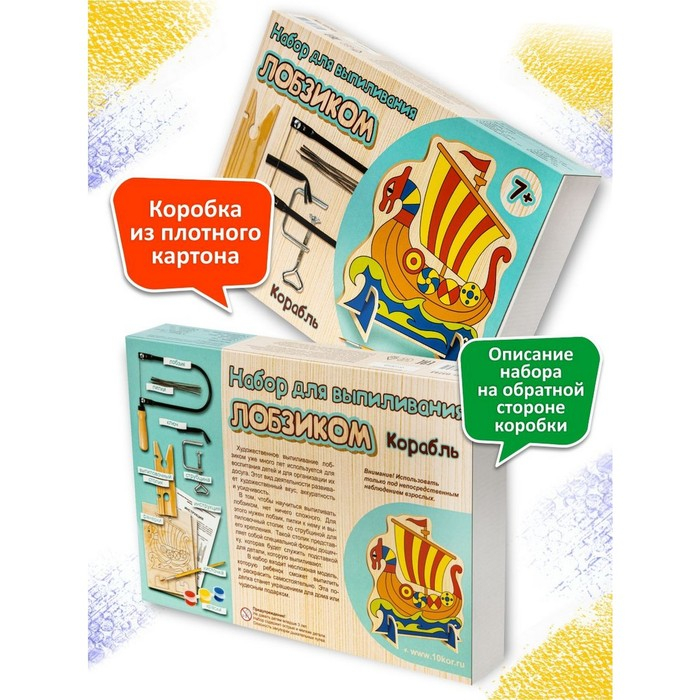 Откройте новый вид досуга для своего ребёнка — художественное выпиливание лобзиком. Набор для выпиливания лобзиком «Корабль» развивает у ребёнка художественный вкус, аккуратность и усидчивость. В набор входит несложная модель корабля, которую ребёнок сможет выпилить самостоятельно, и подробная инструкция.