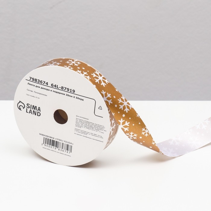 Новый год. Лента для декора и подарков, снежинки, 2 см х 45 м