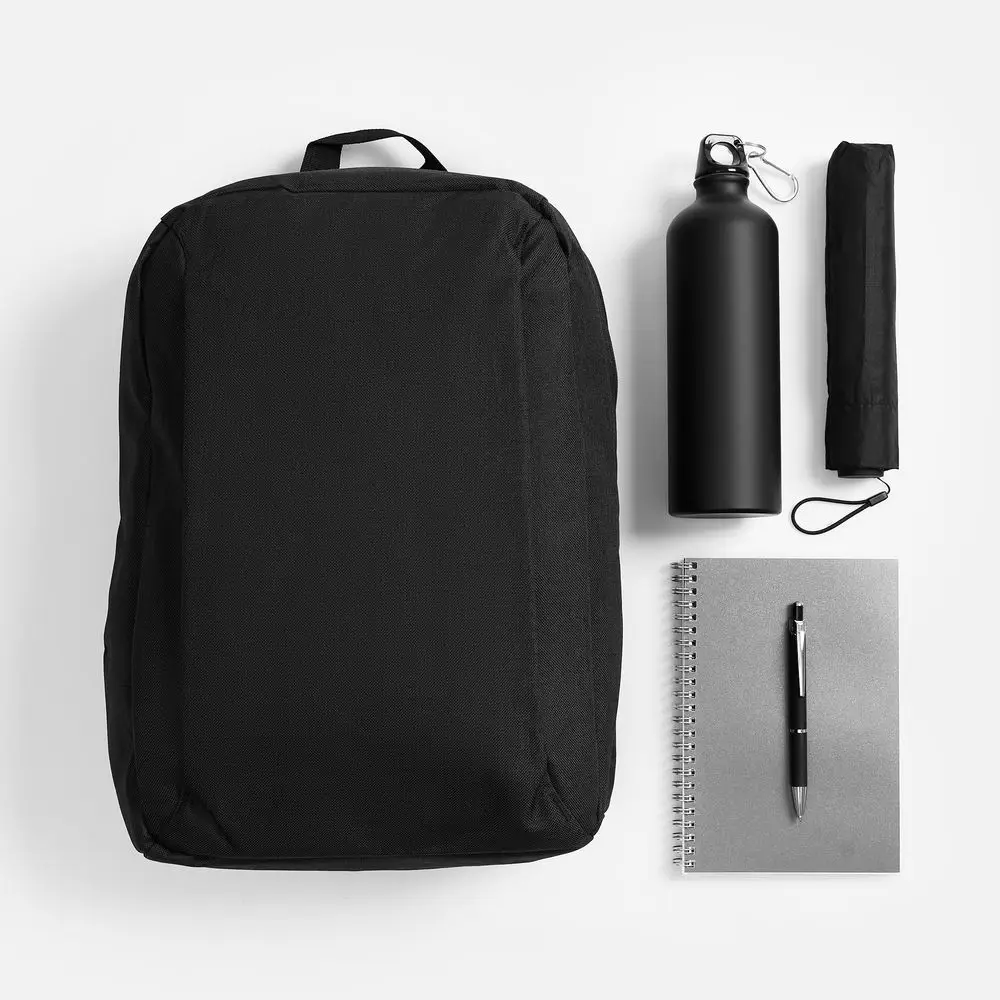 рюкзак - полиэстер, 600D; купол зонта - полиэстер, 300T; спицы - стеклопластик; ручка зонта - прорезиненный пластик; рама зонта, бутылка для воды - алюминий; блокнот - картон, бумага; пластик; ручка - металл, грип - пластик; покрытие софт-тач