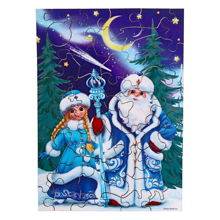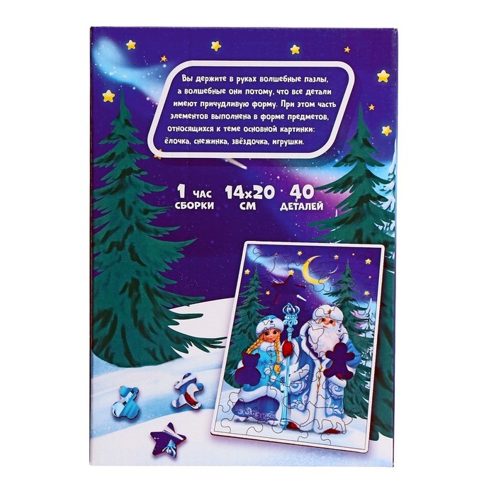 Погрузитесь в новогоднюю сказку с волшебными пазлами! Яркие краски, необычная иллюстрация, экологичный материал. И это еще не всё! Вы только приглядитесь: каждый элемент - это отдельная фигурка со своей историей! При этом некоторые элементы выполнены в форме предметов, относящихся к теме основной картинки.