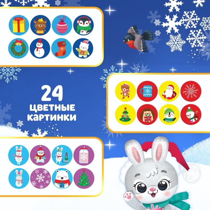 В набор входят: проектор-фонарик, 3 слайда (24 цветные картинки) и 12 светящихся в темноте снежинок.