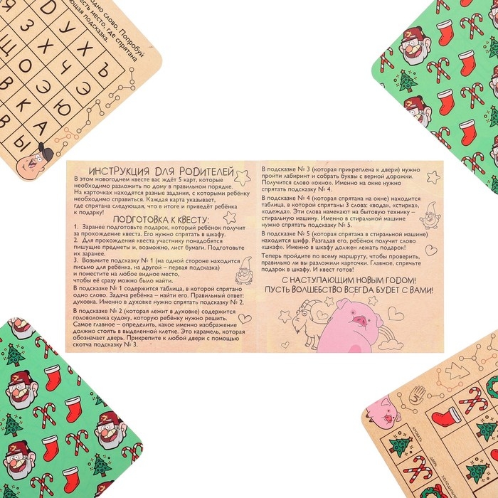 Разложите карточки с заданиями в указанном порядке. Участника ждут шифры, ребусы, вырезалки, кроссворды и другие интересные задачи.