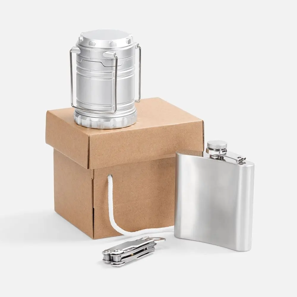 Практичный сет для похода в лаконичном и стильном исполнении: мультитул-плоскогубцы, кемпинговый фонарь с дальностью луча 20 метров и классическая фляжка.
