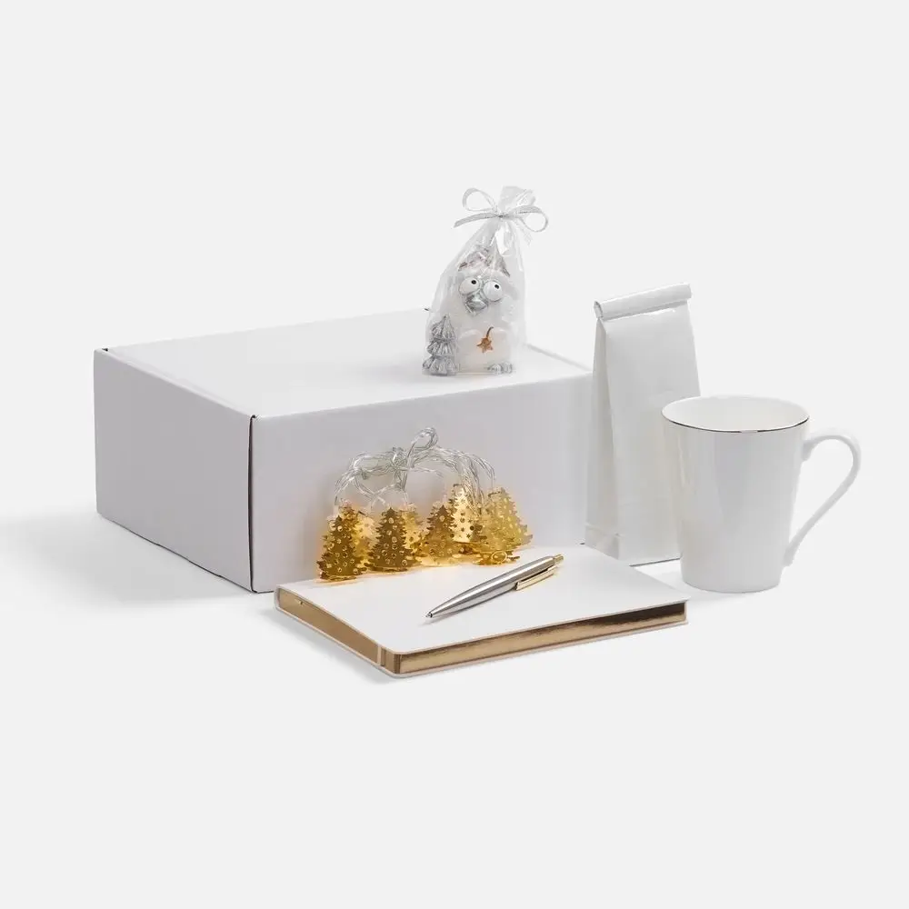 кружка - костяной фарфор; гирлянда - пластик, металл; свеча - парафин; ежедневник - искусственная кожа; ручка - металл