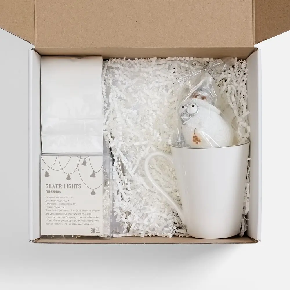 кружка - костяной фарфор; гирлянда - пластик, металл; свеча - парафин; ежедневник - искусственная кожа; ручка - металл