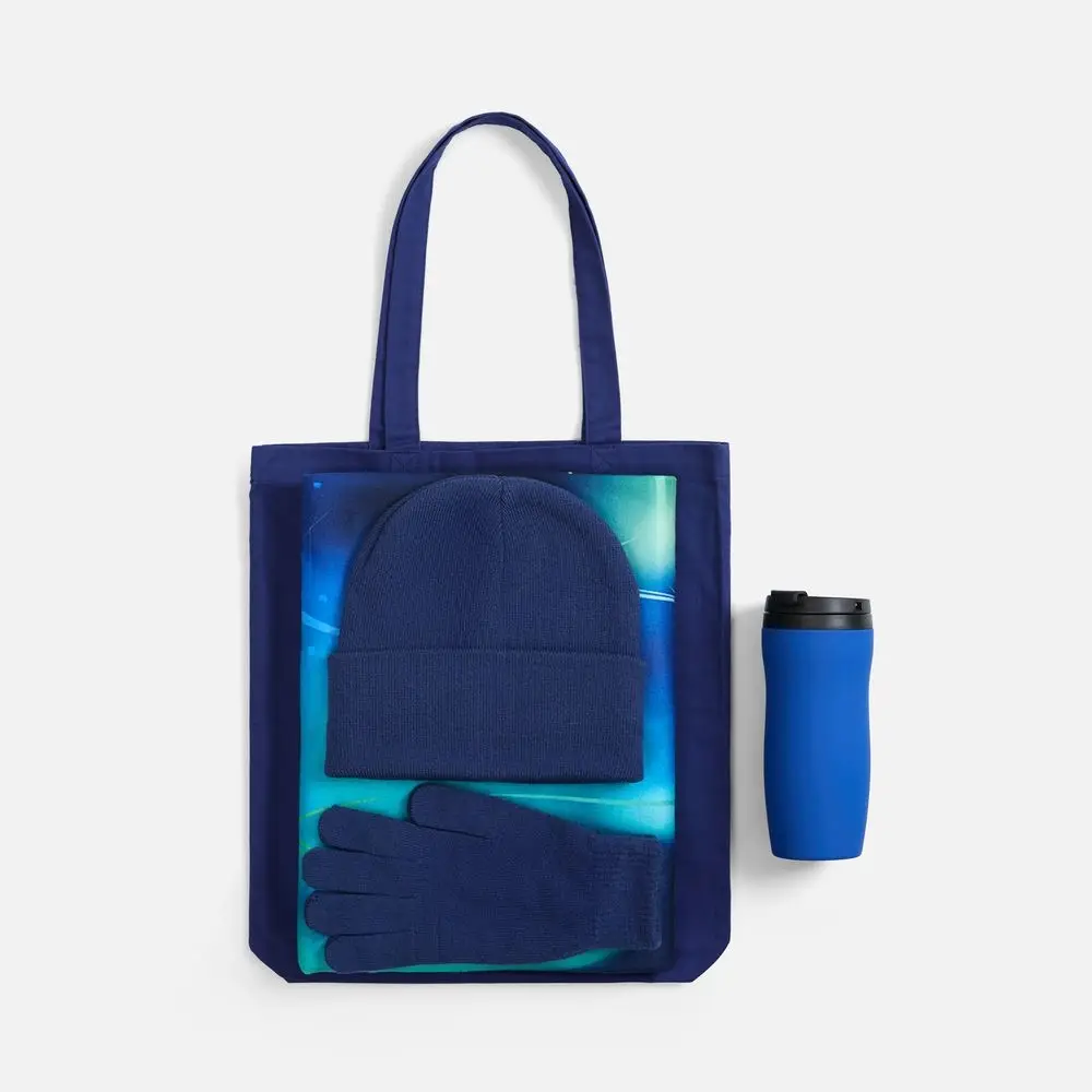 Набор «Ваше сиятельство» — это выражение заботы и нетривиальный комплимент в одном шопере! В нем тонко переплетены дух современного города и очарование северной сказки. Его элементы лаконичны и функциональны, а главная изюминка — живописный плед с изображением северного сияния — добавляет ноту настоящего чуда.