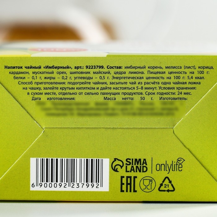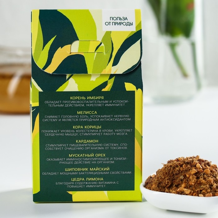 Состав: имбирный корень, мелисса (лист), корица, кардамон, мускатный орех, шиповник майский, цедра лимона.