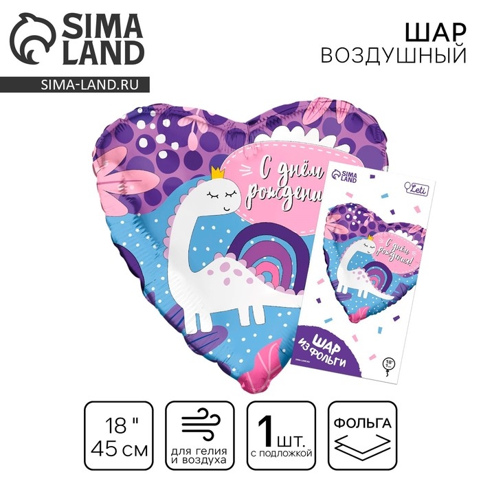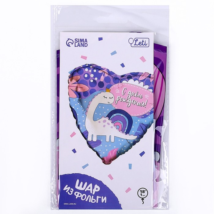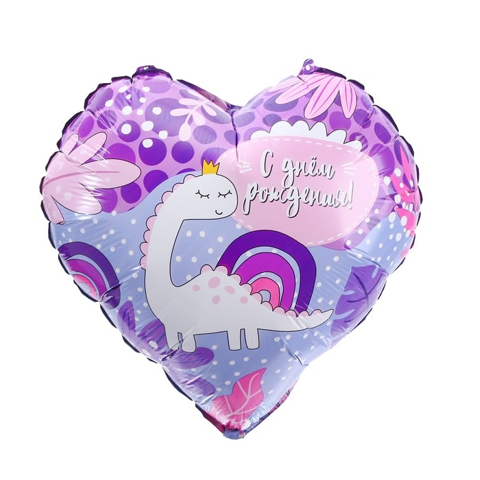 Воздушный шар фольгированный 18" «С ДР! Динозаврик», сердце, с подложкой