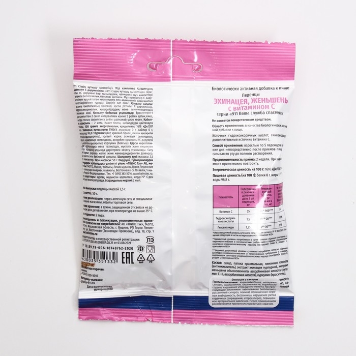 Леденцы от кашля"911"эхинацея, женьшень, витамин С, 50 г