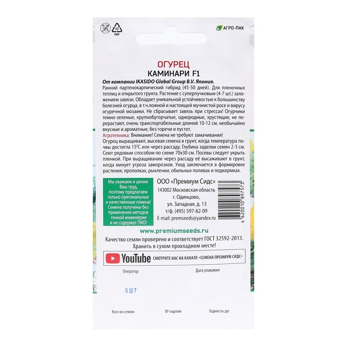 Семена огурца "Великолепная пятерка", F1,набор 5 шт