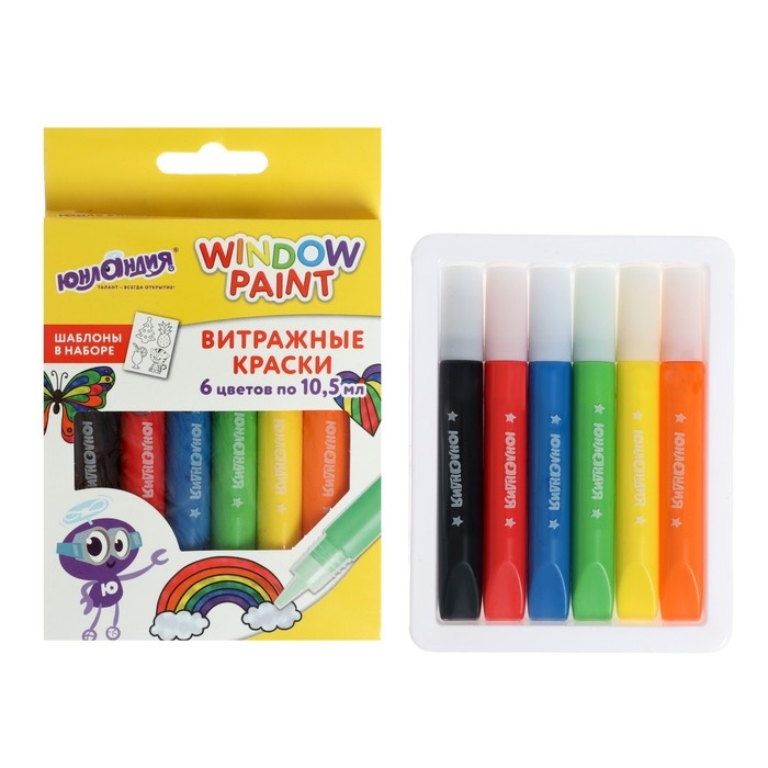Краска по стеклу витражная Аппликация набор 6цв*10.5-11мл ЮНЛАНДИЯ шаблоны, 191758