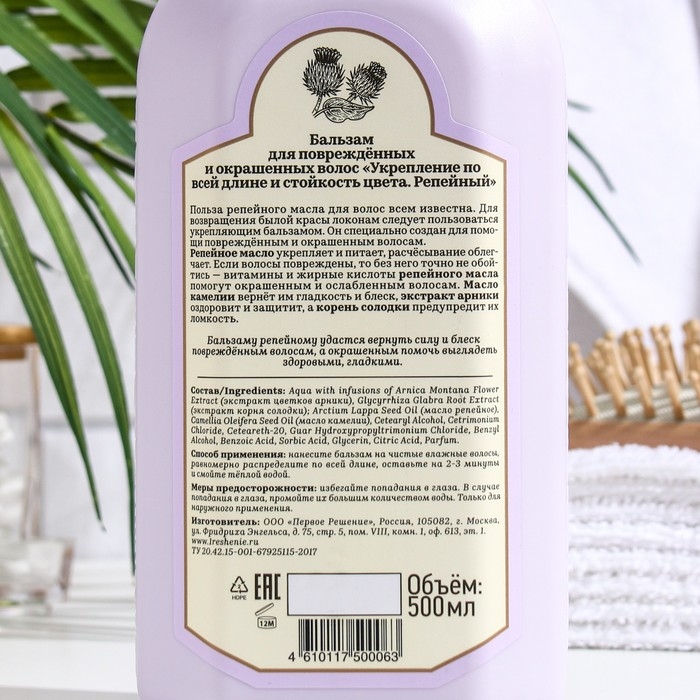 Репейное масло укрепляет и питает, расчесывание облегчает. если волосы повреждены, то без него точно не обойтись. Витамины и жирные кислоты репейного масла помогут окрашенным и ослабленным волосам. масло камелии вернёт им гладкость и блеск, экстракт арники оздоровит и защитит, а корень солодки предупредит их ломкость. Бальзаму репейному удастся вернуть силу и блеск повреждённым волосам, а окрашенным выглядеть здоровыми и гладкими.