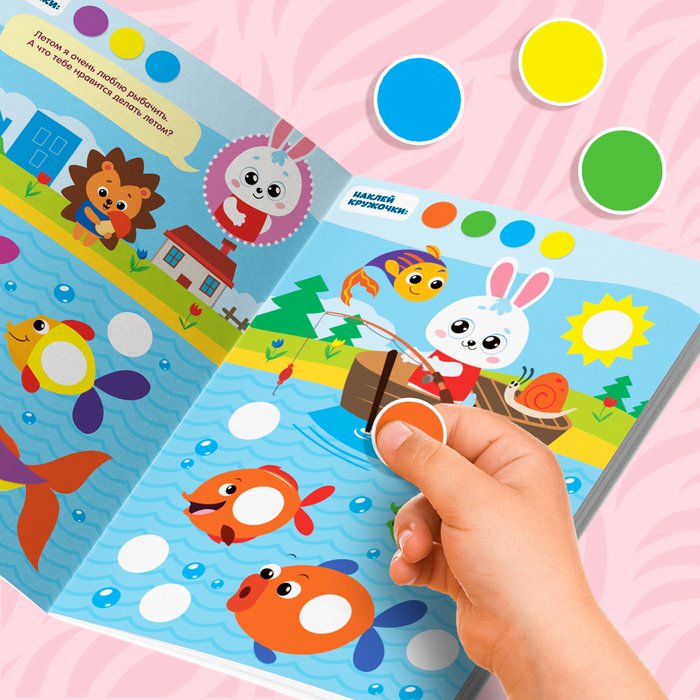 - Красочные картинки и милые персонажи подсказывают, куда именно нужно прикрепить наклейку-кружочек.