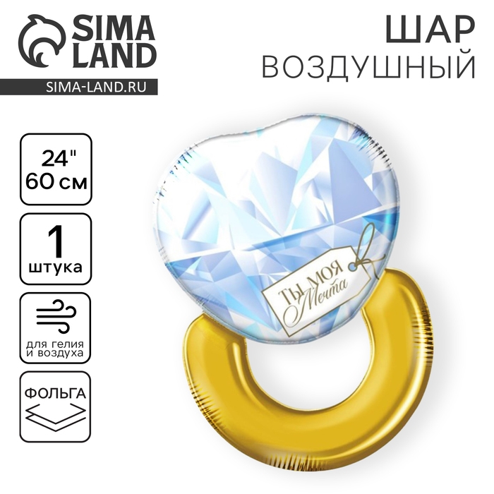 Фольгированный шар в виде кольца с бриллиантом поможет оформить помещение для празднования помолвки или свадьбы. На шаре есть надпись «Ты моя мечта». Подойдёт для оформления фотозоны. Из нескольких шаров можно создать букет.