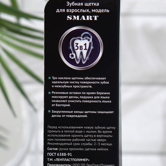 Зубная щётка «Смарт» средней жесткости эффективно удалит налёт и очистит полость рта, не травмируя её при этом. Специальные щетинки подстраиваются под контуры зубов, проникают даже в труднодоступные места.