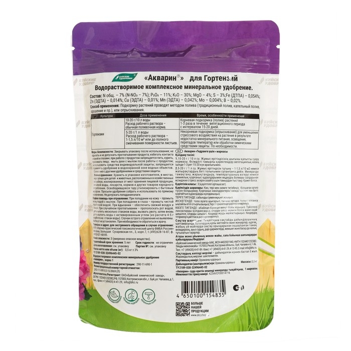 Акварин для гортензий - водорастворимое удобрение, в состав которого входит азот, фосфор, калий, магний, сера и микроэлементы – железо, цинк, марганец, медь в хелатной форме, а бор и молибден – в минеральной. Благодаря кислой реакции (рН) удобрения, оно легко растворяется в холодной воде и более эффективно усваивается корневой системой или листовой поверхностью растений.