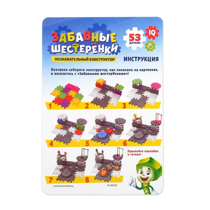 «Забавные шестерёнки» — развивающий конструктор для детей от 5 лет. Соединяйте детали между собой, как показано на инструкции или любым другим образом как подсказывает ваша фантазия. Наблюдайте за тем, как крутятся различные детали собранного конструктора.