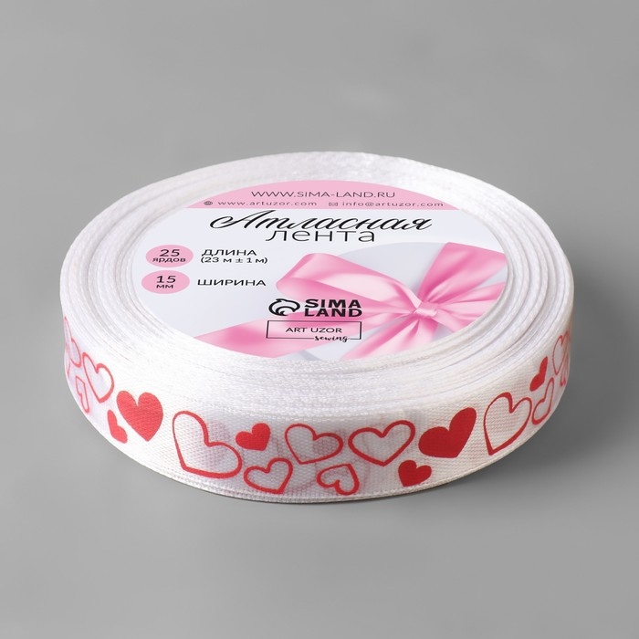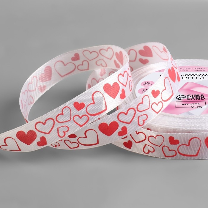 Лента атласная «Сердечки», 15 мм × 23 ± 1 м, цвет белый/красный №001
