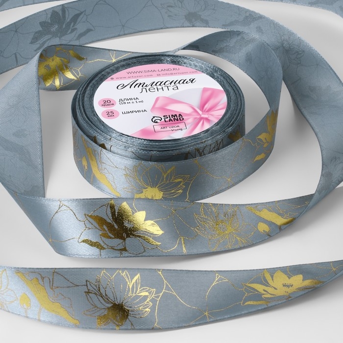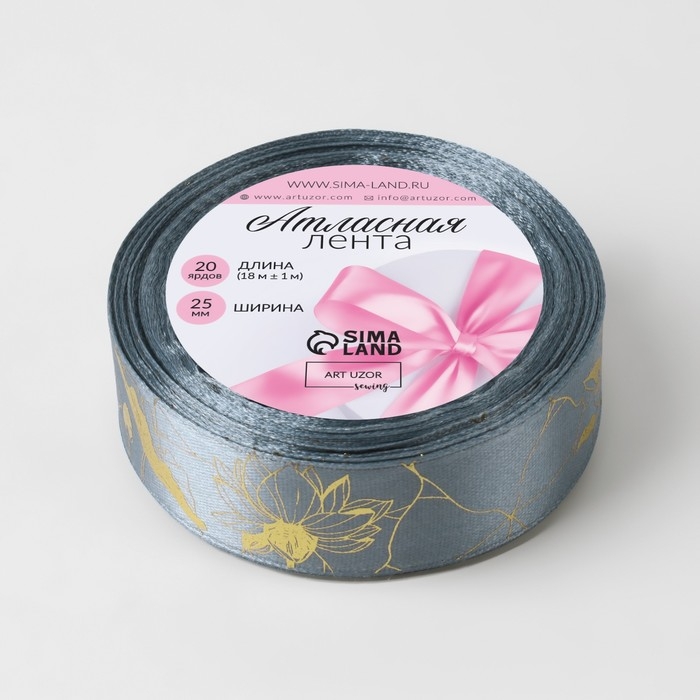 Лента атласная с тиснением «Лотос», 25 мм × 18 ± 1 м, цвет тёмно-серый/золотой №189