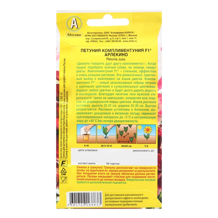 Стильное, эффектное и очень изящное растение. Это романтичный, практичный выбор и комплимент на языке цветов. Комплиментуния F1 – эксклюзивный гибрид (новая петуния) с крупными цветками и суперобильным цветением. Украсит любой цветник и будет долго дарить радость и восхищение. Благодаря наличию гена мужской стерильности семян не завязывает, направляя всю энергию на формирование новых цветков. Форма растений кустовая, со склонностью к трейлингу: ширина больше высоты. Высота 20-25 см, ширина 25-30 см. Быстро разрастается. Растения устойчивы к болезням, выдерживают дождливую и ветреную погоду, переносят кратковременные заморозки до –5°С и экстремальную жару до +40°С без потери декоративности.