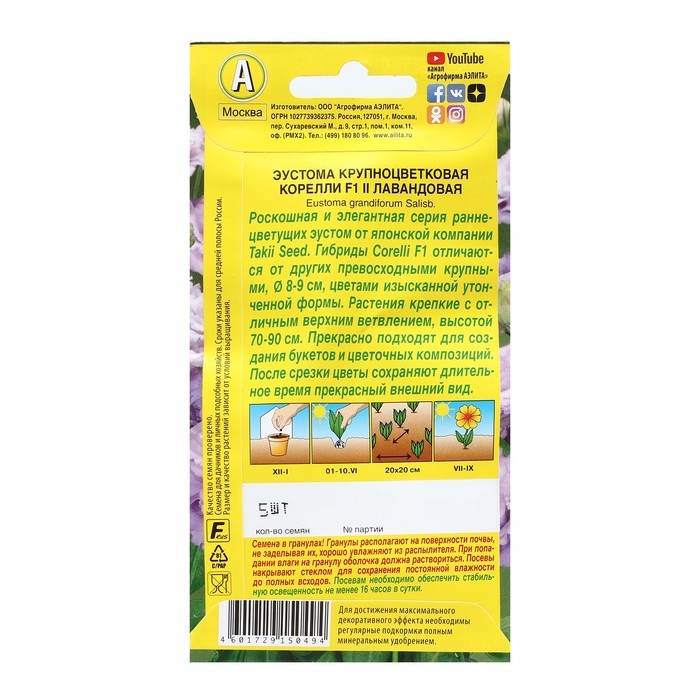 Роскошная и элегантная серия раннецветущих эустом от японской компании Takii Seed. Гибриды Corelli F1 отличаются от других превосходными крупными, ? 8-9 см, цветами изысканной утонченной формы. Растения крепкие с отличным верхним ветвлением, высотой 70-90 см. Прекрасно подходят для создания букетов и цветочных композиций. После срезки цветы сохраняют длительное время прекрасный внешний вид.