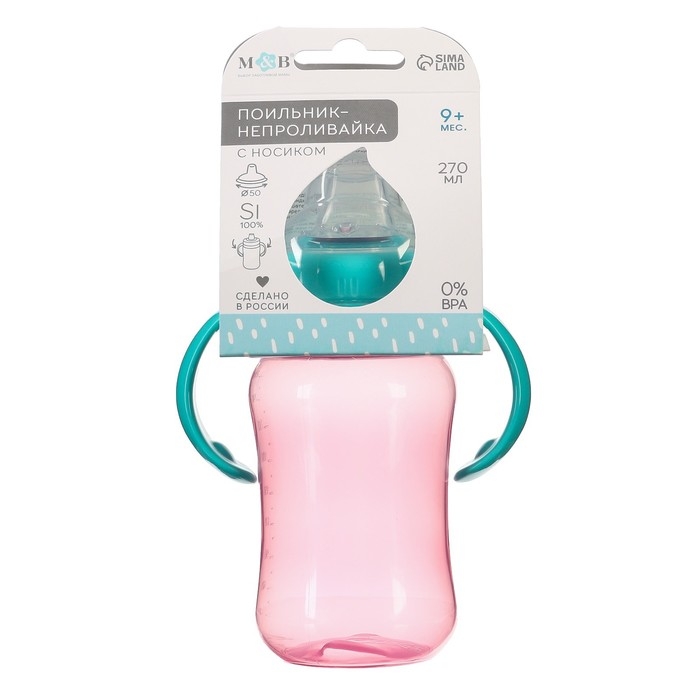 Поильник - непроливайка детский с мягким носиком, 270 мл., с ручками, цвет розовый/бирюзовый