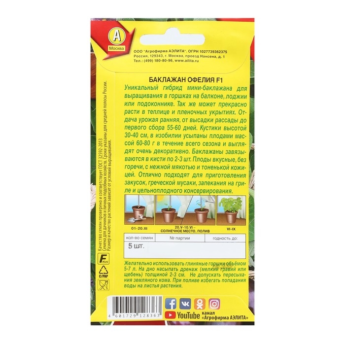 Семена Баклажан "Офелия", F1, 5 шт