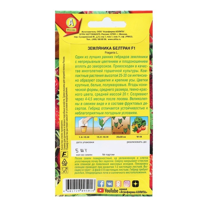 Универсальный гибрид, сочетает в себе раннеспелость, уникальные декоративные качества и продуктивность. Формирует аккуратный густооблиственный непрерывно цветущий кустик высотой до 30 см, с нарядными белыми полумахровыми цветками и цветущими розетками на концах длинных усов. Первый урожай убирают через 4 месяца после посева и продолжают сбор до заморозков. Ягоды крупные, красивой конической формы, сладкие, сочные, с отменными вкусовыми качествами, массой 20 г. Прекрасный гибрид для выращивания в подвесных корзинах, кашпо и вазонах. Посев земляники производят в марте-апреле. Семена равномерно распределяют по увлажненной ровной поверхности. Всходы появляются в течение 30 дней. В фазе 1-2 настоящих листьев саженцы пикируют в горшочки. После появления 6 настоящих листьев высаживают в грунт с расстоянием между рядами 25-30 см, между растениями 15-20 см. Сбор урожая начинают со второй половины июня.