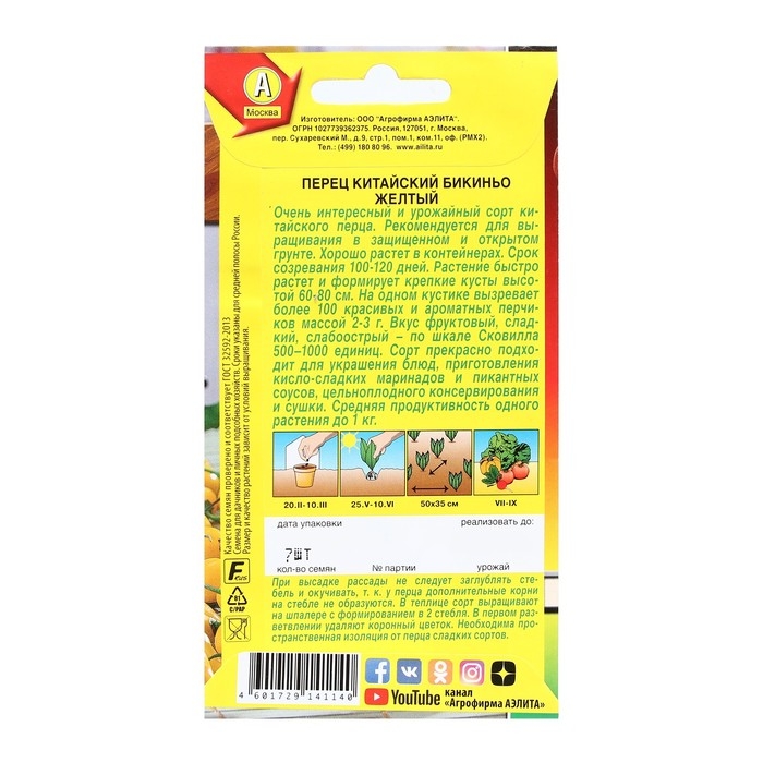Семена Перец китайский слабоострый "Бикиньо желтый", Шкала Сковилла, 7 шт