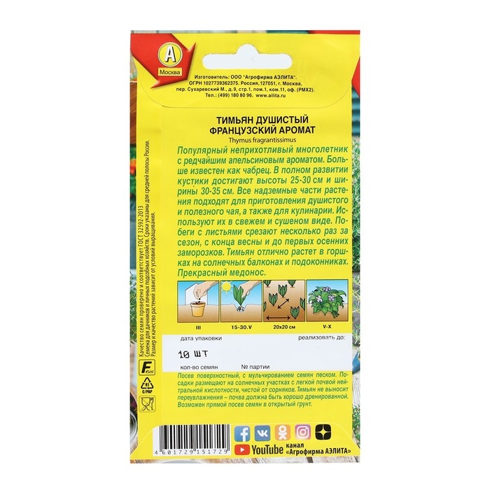 Семена Тимьян овощной "Лимончелло", ц/п, 0,2 г
