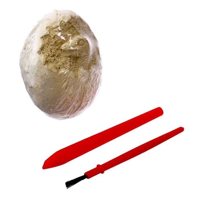 В наборе: долото, кисточка, окаменелое яйцо с кладом внутри.