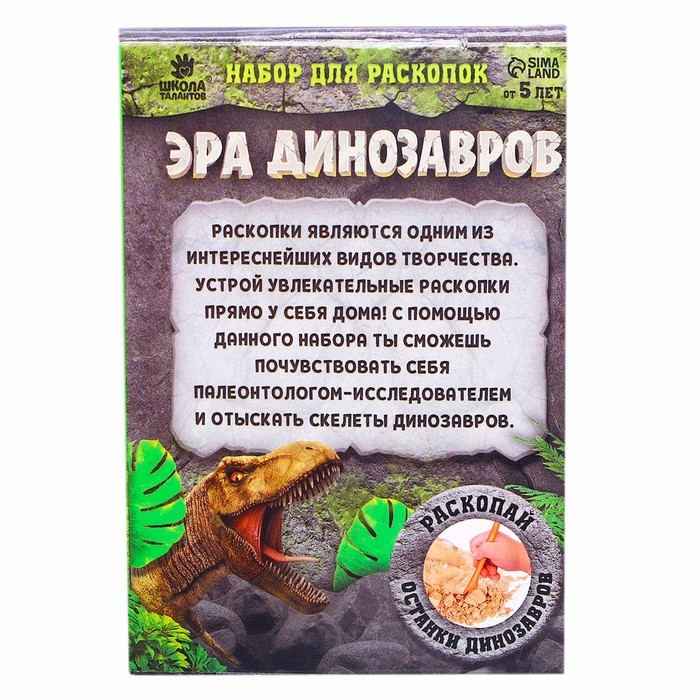 Набор для раскопок не оставит равнодушными любознательных исследователей истории планеты Земля. С помощью этого набора ребёнок почувствует себя настоящим палеонтологом — исследователем динозавров!