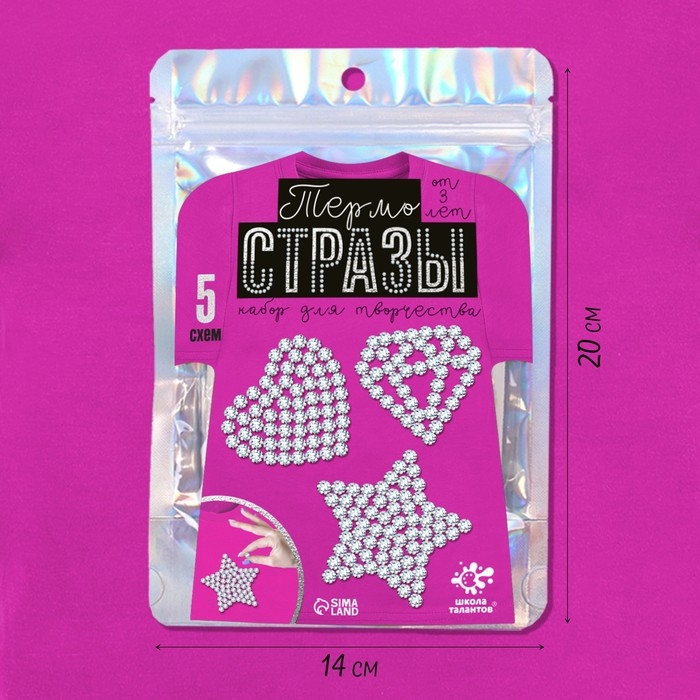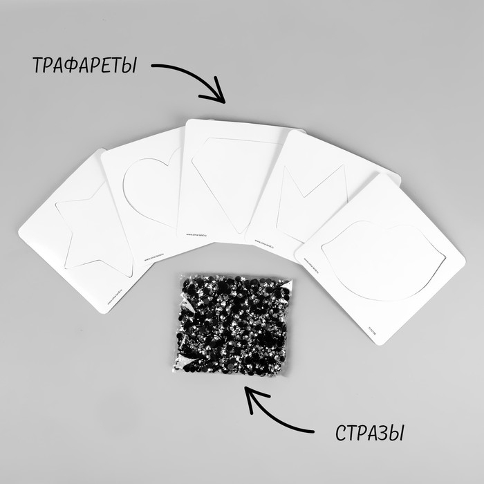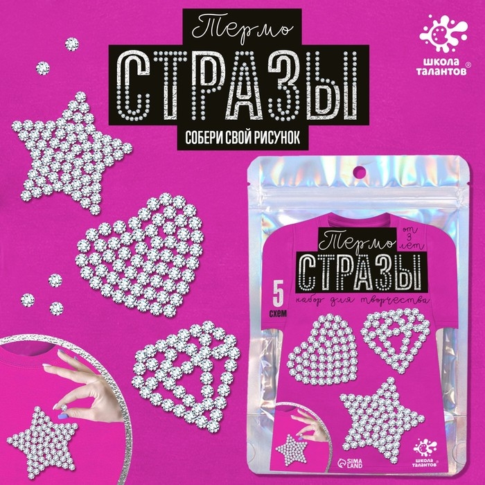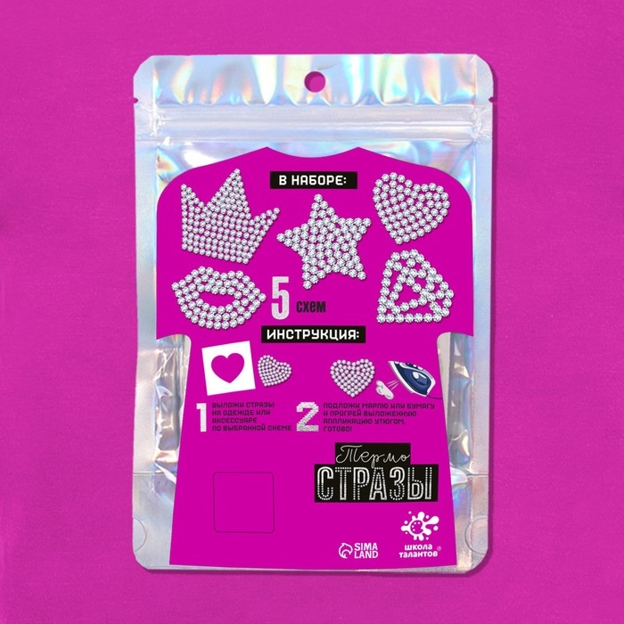 Термостразы созданы для декорирования ткани и аксессуаров. В наборе вы найдёте 5 схем выкладки и пакетик со стразами.