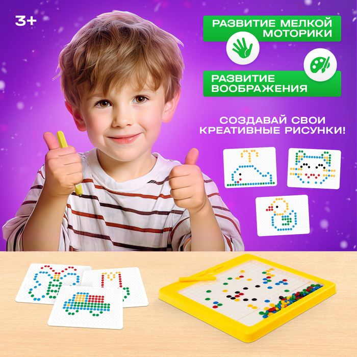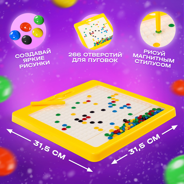 Магнитный планшет для рисования «Пуговки», большой, 10 трафаретов, 266 ячеек, 126 пуговок