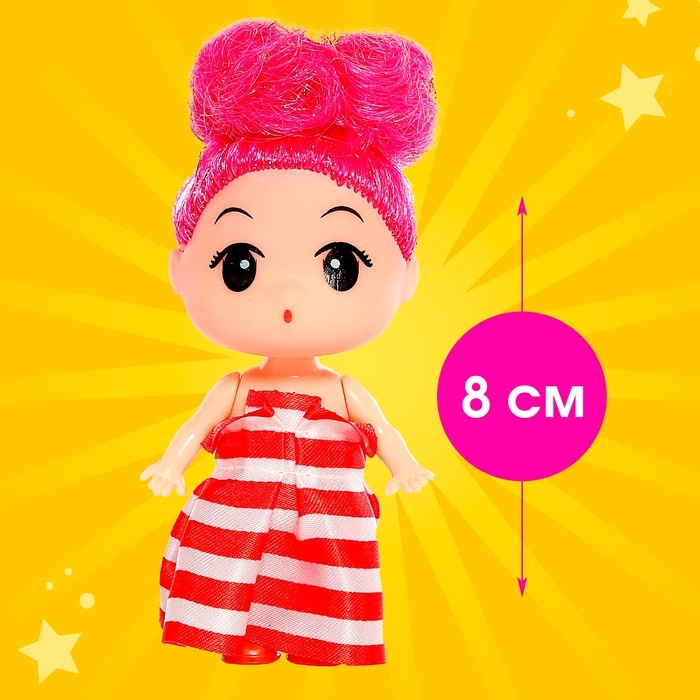 - Высота куклы — 8 см. Игрушка очень компактная, поэтому её удобно захватить с собой на прогулку, в гости и даже в путешествие.
