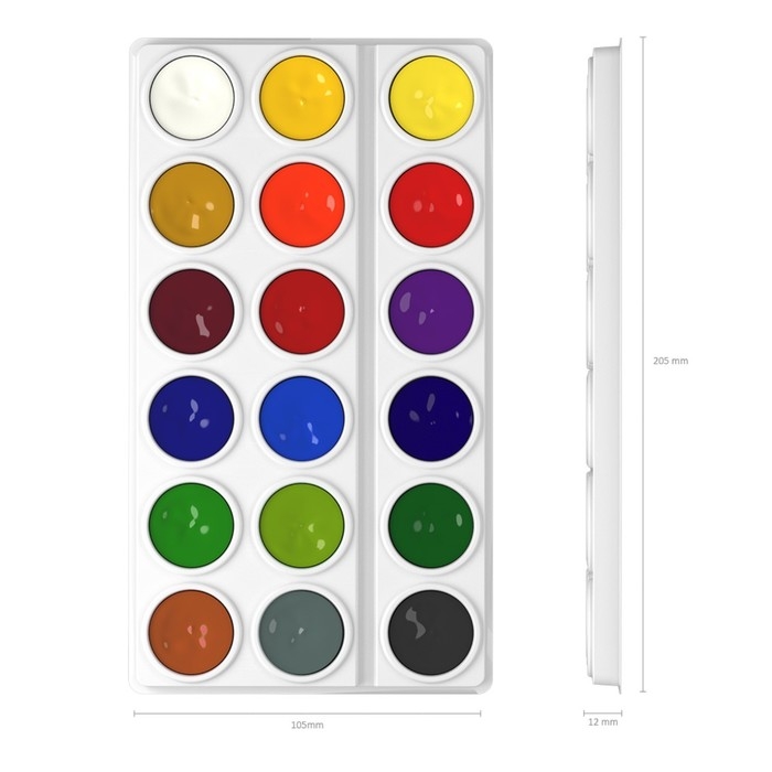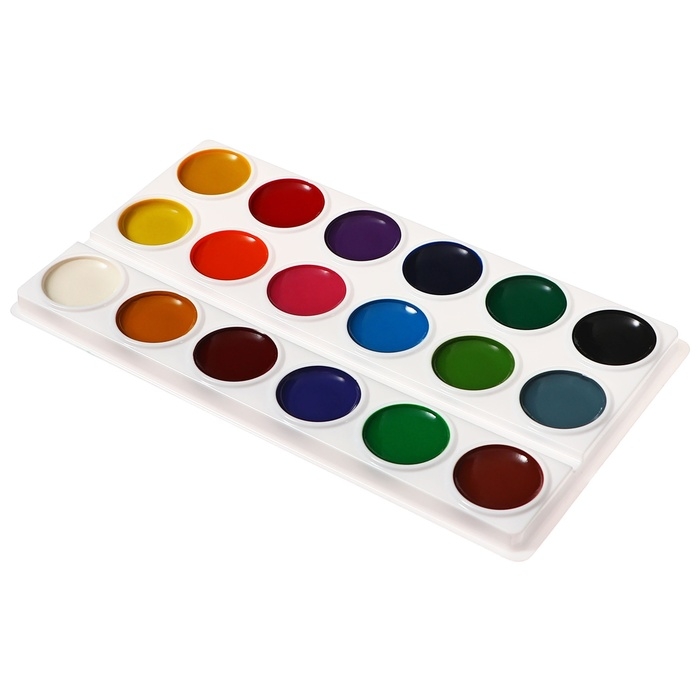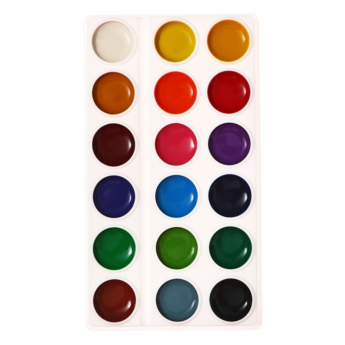 Классические акварельные полусухие краски в облегченной пластиковой палетке без крышки, представлены в картонной упаковке с хидером.