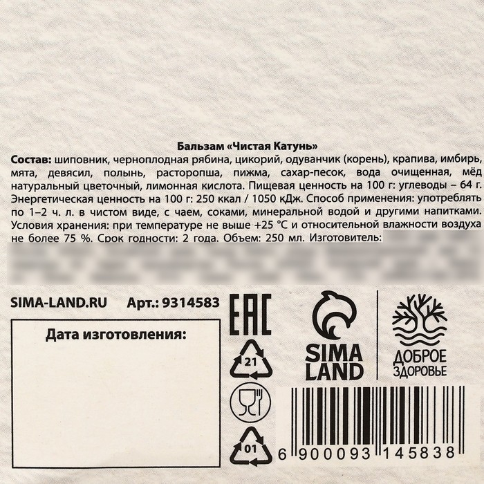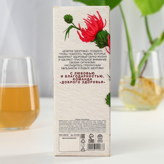 Состав: шиповник, черноплодная рябина, цикорий, одуванчик (корень), крапива, имбирь, мята, девясил, полынь, расторопша, пижма, сахар-песок, вода очищенная, мёд натуральный цветочный, лимонная кислота.
