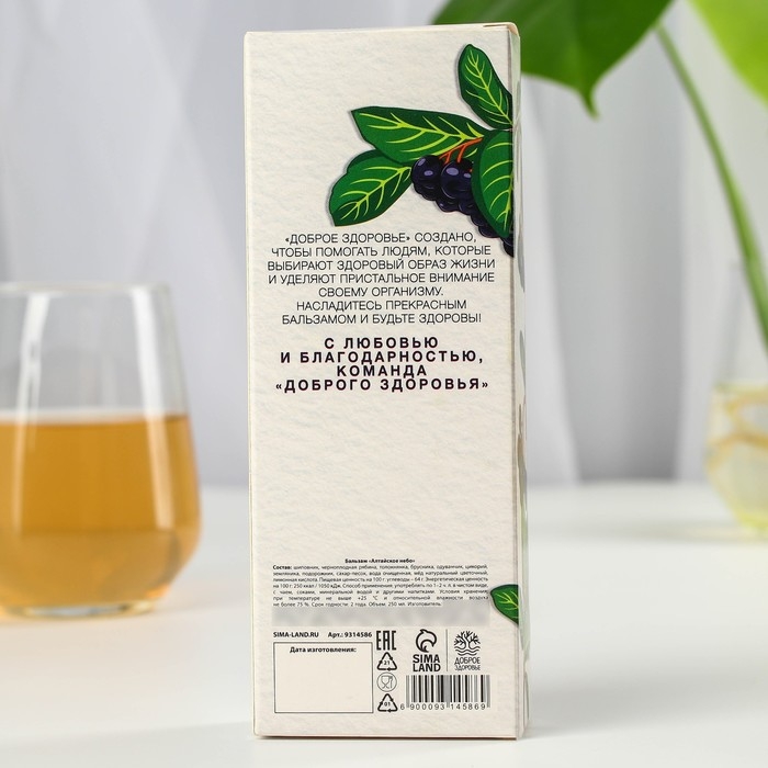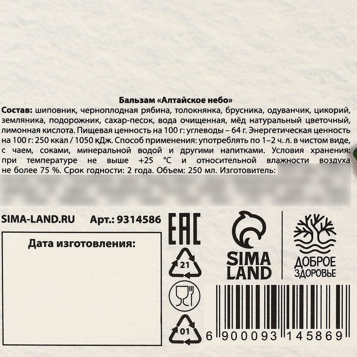 Состав: шиповник, черноплодная рябина, толокнянка, брусника, одуванчик, цикорий, земляника, подорожник, сахар-песок, вода очищенная, мёд натуральный цветочный, лимонная кислота.