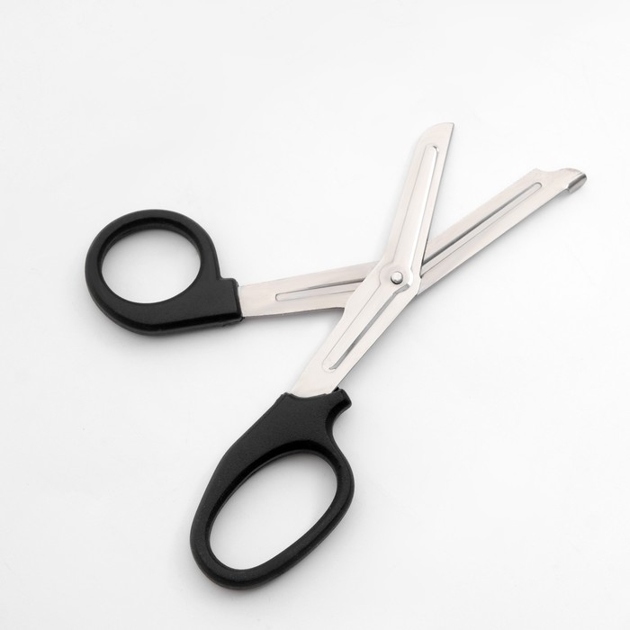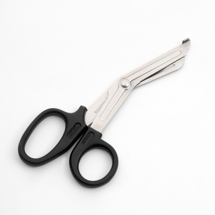 Медицинские ножницы тупоконечные, со специальным изгибом исключают возможность случайно нанести порез. Одно из лезвий оснащено заостренной засечкой, позволяя разрезать плотные и толстые ткани. Форма ножниц и рукояти позволяет совершать нажатие с большей силой. Используются. чтобы разрезать камуфляжную куртку, толстый свитер, плотные джинсы и другие плотные ткани. Входят в состав большинства аптечек, в том числе тактических аптечек, автомобильных и аптечек на производстве.