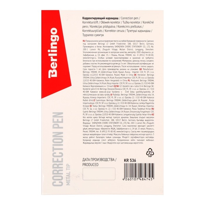 Выбирая корректирующий карандаш Berlingo, вы получаете высокое качество и надежность в каждой детали. Это идеальный инструмент для офиса, учебы и дома, который поможет вам всегда поддерживать ваши документы в безупречном состоянии.
