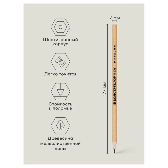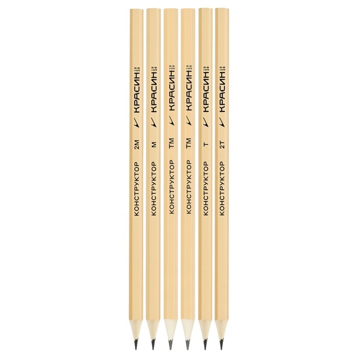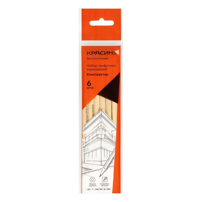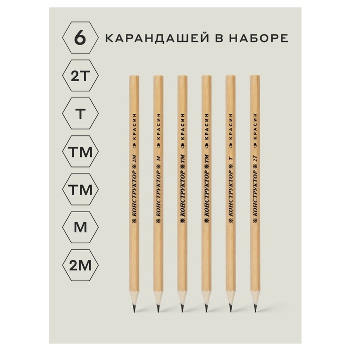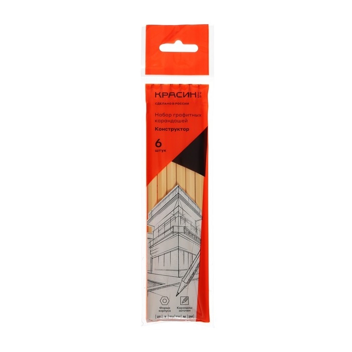 Набор карандашей чёрнографитных Красин "Конструктор" 2Н, Н, 2хНВ, В, 2В, шестигранные, европодвес, 6 штук
